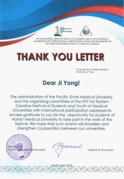 活动结束后,太平洋国立医科大学管理部门与创意节组委会联合向永利发来感谢信,信中表示:"衷心感谢77779193永利官网学生参与远东创意节的工作。贵校学子在活动中展现的专业素养与团队精神令人钦佩,不仅为创意节注入了多元文化活力,更成为两校医学教育交流的桥梁。我们期待以此为契机,扩大和加强两校在学术研究、学生交换、国际赛事等领域的合作,共同培养具有全球视野的医学人才"。