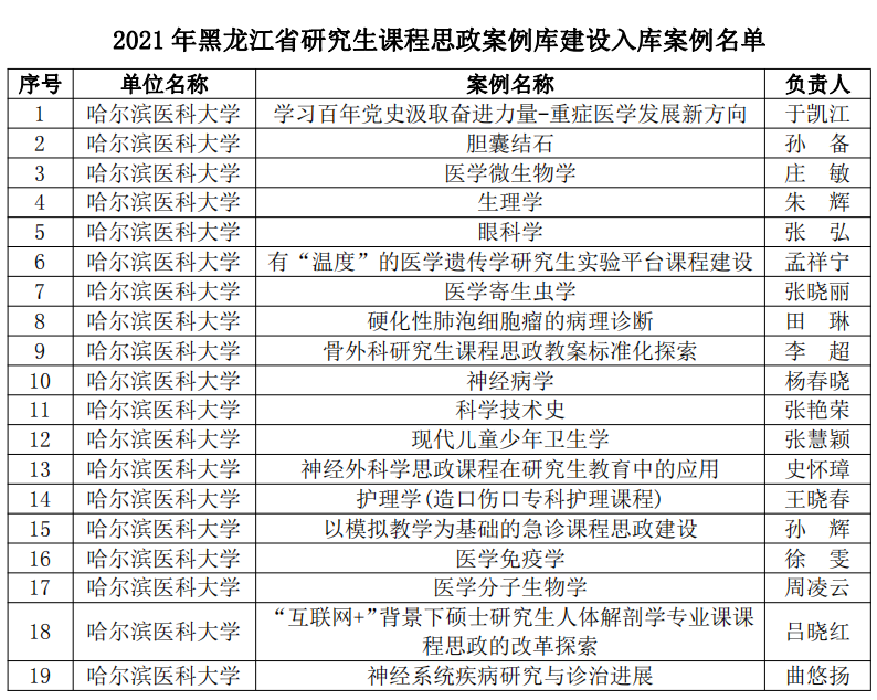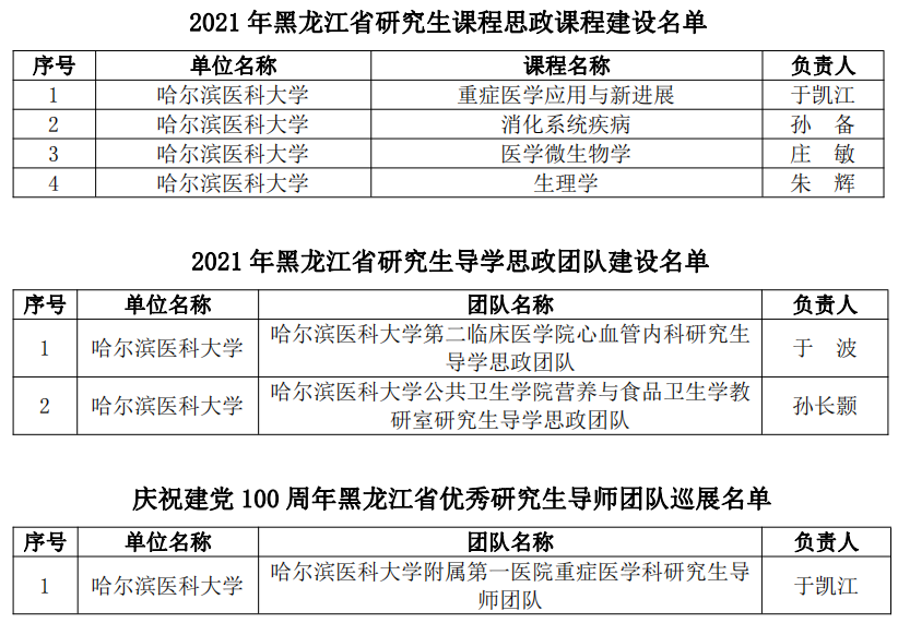 为贯彻落实国家《关于全面落实研究生导师立德树人职责的意见》《高等学校课程思政建设指导纲要》《关于加快新时代研究生教育改革发展的意见》精神,按照《关于加快新时代黑龙江省研究生教育改革发展的实施意见》要求,日前,经全省研究生培养单位遴选推荐,黑龙江省研究生课程思政教育联盟专家委员会评审,省学位委员会、省教育厅批准,永利共有26个项目获批省级立项,其中研究生课程思政课程建设项目4个、研究生导学思政团队(导师)建设项目2个、研究生课程思政案例19个,庆祝建党100周年巡展优秀研究生导师团队1支。