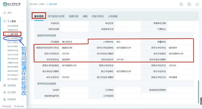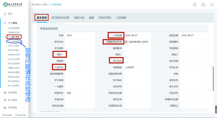 3、因部分学籍信息研究生没有权限自行修改,在填写过程中如遇到此类信息与本人情况不符,请进入“个人管理”模块下的“信息修改申请”部分,按照图7的指示申请修改学籍信息,待管理端教师审核通过后即可修改。