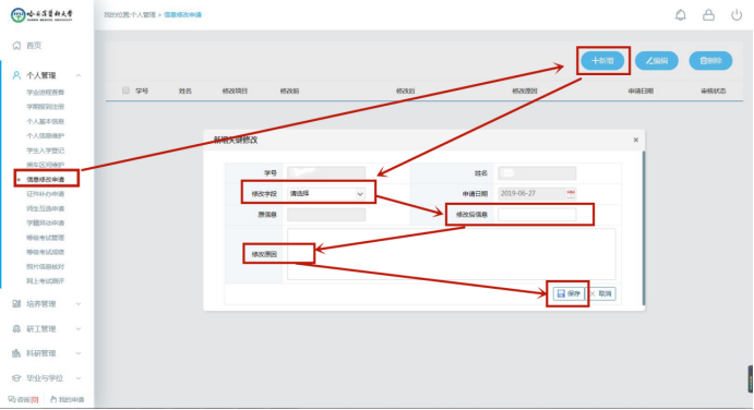 3.因部分学籍信息研究生没有权限自行修改,在填写过程中如遇到此类信息与本人情况不符,请进入“个人管理”模块下的“信息修改申请”部分,按照图7的指示申请修改学籍信息,待管理端教师审核通过后即可修改。