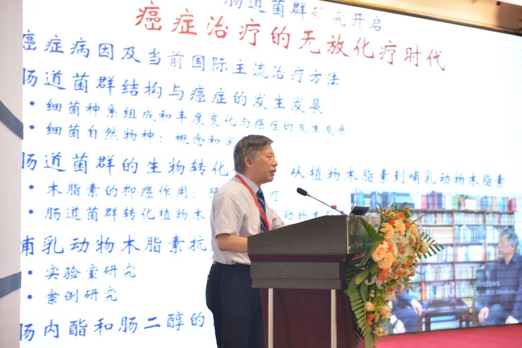 77779193永利官网药学院基因组中心主任、黑龙江省肠道菌群与药物基因组学重点实验室主任刘树林教授作了题为《肠道菌群研究开启癌症治疗的无放化疗时代》的报告,探讨应用木脂素调整肠道菌群,并通过生物转化作用生产肠二醇和肠内酯,抑制肿瘤细胞生长。细胞水平和动物实验水平的研究都已表明非放化疗癌症治疗的可行性。