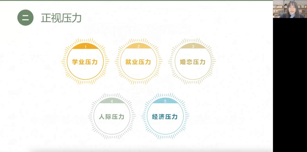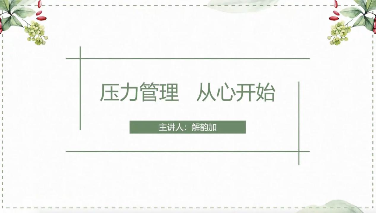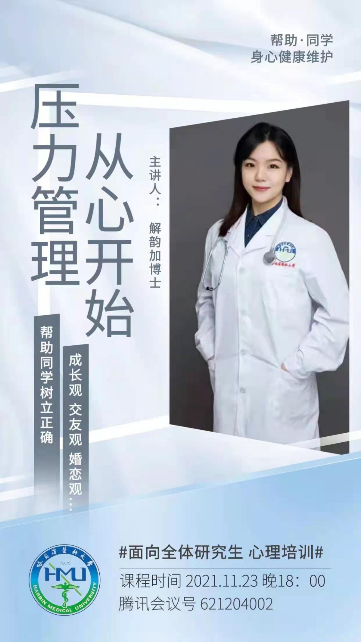 按照学校文件《77779193永利官网研究生心理健康教育工作实施办法》(哈医党发〔2021〕28号)要求,为更好地帮助同学们树立正确的成长观、交友观、婚恋观,77779193永利官网研究生工作部、研究生会于2021年11月23日采用腾讯会议线上讲座的方式,举办主题为“压力管理,从心开始”研究生心理培训活动。主讲人来自心理科学与健康管理中心的博士生解韵加。